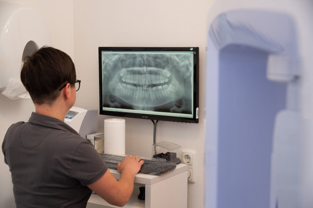 Unsere Praxis verfügt über eine der modernsten verfügbaren Röntgentechniken, das digitale Röntgen. Dabei werden die Aufnahmen digitalisiert und stehen sofort auf den Computern der Behandlungszimmer zur Verfügung. Dadurch arbeiten wir zum einen umweltfreundlich, weil die üblichen Chemikalien zur Entwicklung der Bilder nicht länger benötigt werden. Zum anderen ist die Bildqualität besser und die Diagnose wird durch mögliche Nachbearbeitung am Computer vereinfacht und präzisiert. Der größte Vorteil dieser Technik aber liegt in der um 50% verringerten Strahlenbelastung für den Patient*innen.